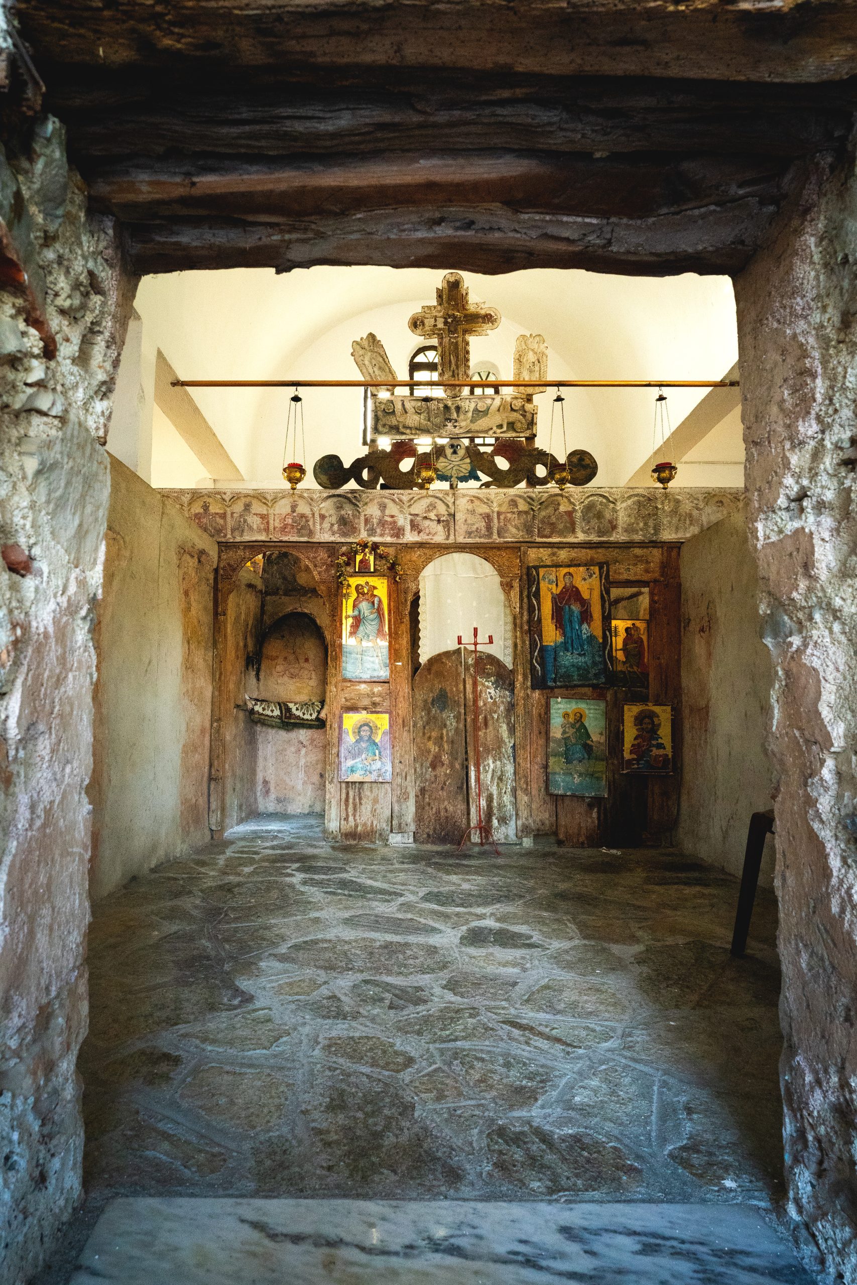 Το παλιό εκκλησάκι, με τους ερειπωμένους τοίχους και τις τοιχογραφίες του 16ου αιώνα, εγκιβωτίζεται στον καινούργιο ναό που το προστατεύει.